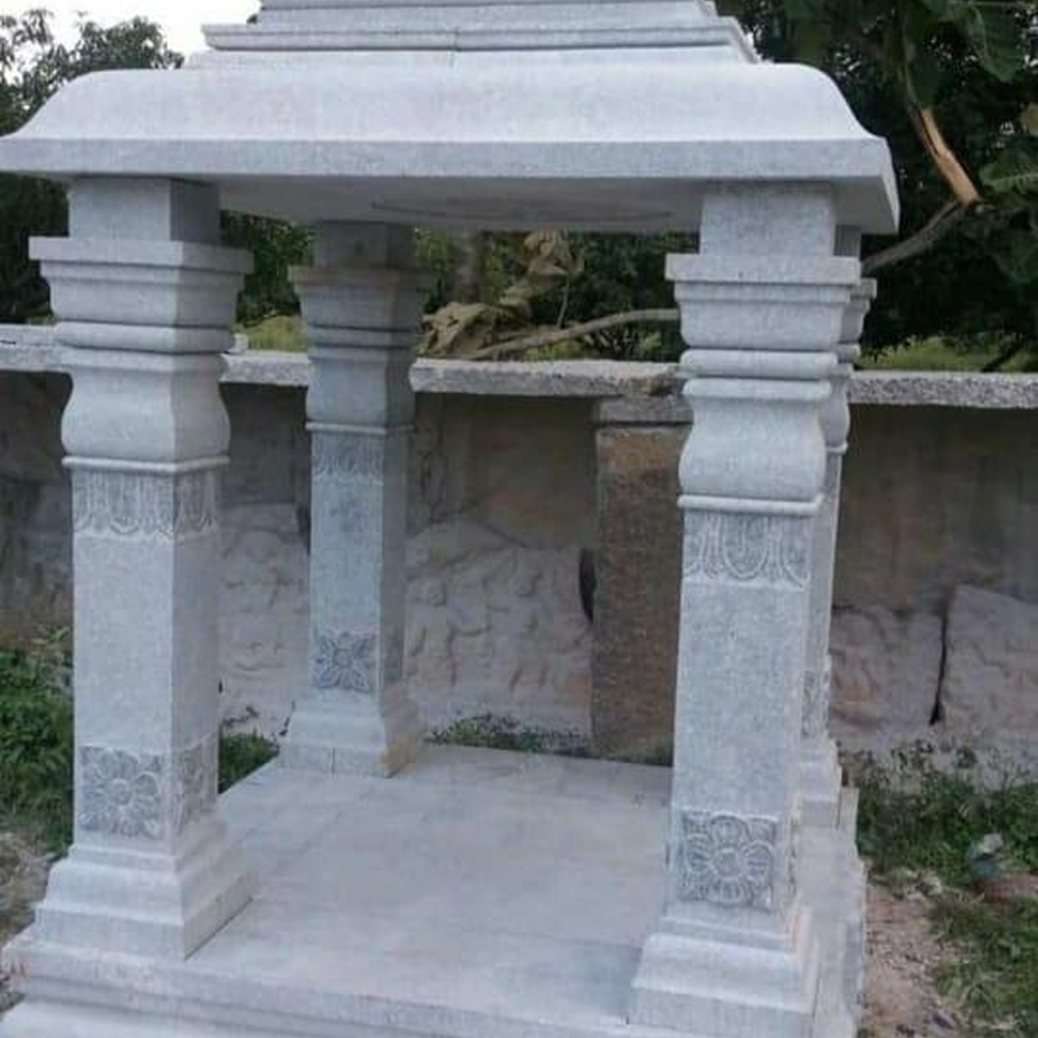 Beautifully crafted stone mandapam designed for pooja rooms, combining spiritual design elements with detailed traditional stone workmanship.
